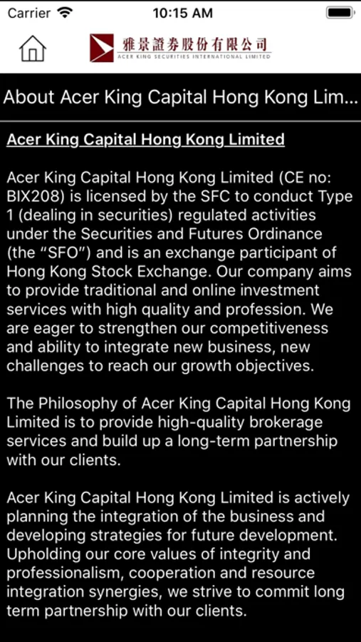 Acer king Securities International Limited (AKSIL) is licensed as SFC Type 1 (Dealing in Securities) licensed corporation and the subsidiary of Acer King Securities Limited (AKSL). The company has been developing diversified securities trading platforms to provide all-rounded investment services. Apart from the established phone order and online securities trading system, Acer king Securities International Limited is now offering a new mobile securities trading system for iOS devices. This new application operates quickly, smoothly and stably, aiding you to exploit every investment opportunities ahead at your fingertips.