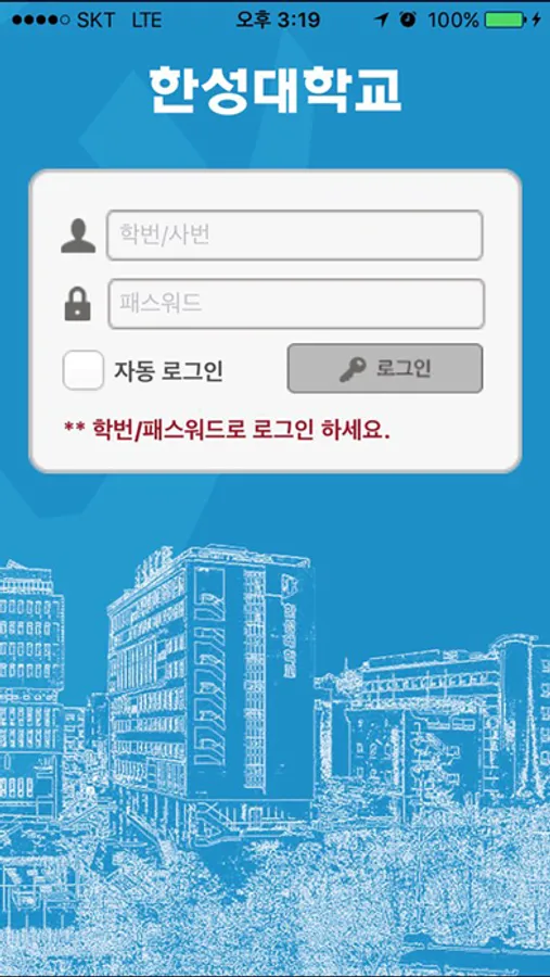한성대학교 포탈에 사용되는 로그인 계정을 그대로 사용하여 로그인하시면 되며,