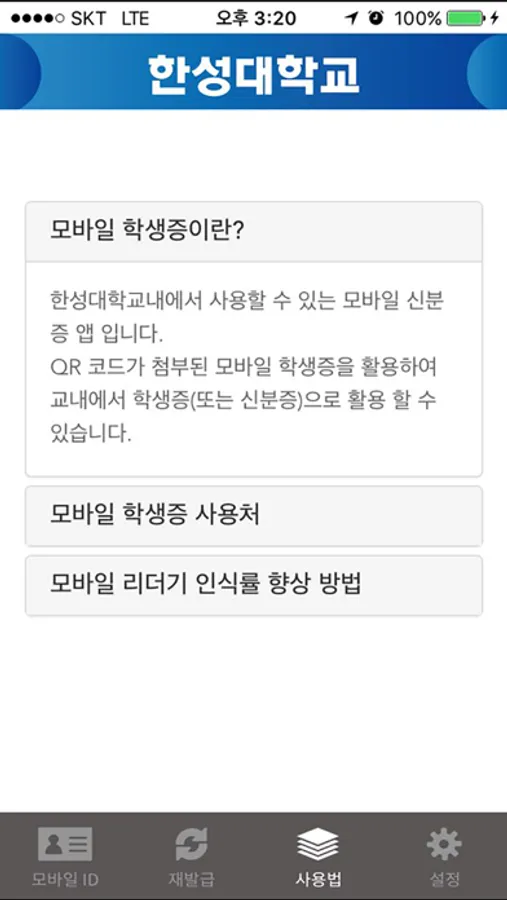 QR 코드가 첨부된 해당 어플을 활용하여 교내와 관련기관에서 학생증(또는 신분증)으로 활용할 수 있습니다.