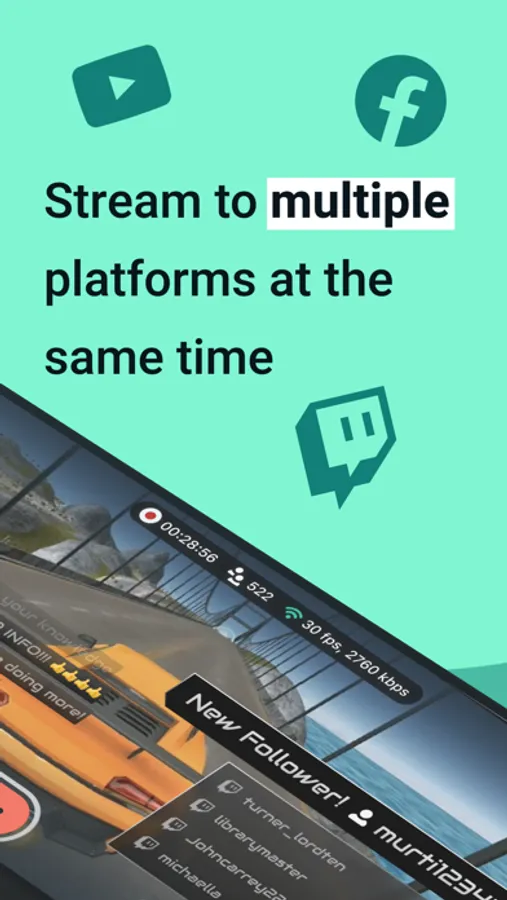 Get rewarded for streaming more. Earn points by going live, setting up your account, and broadcasting to new destinations. Redeem your points inside the app on exclusive rewards like multistream – so you can stream on Twitch, YouTube and more at one time) – and free mobile themes.