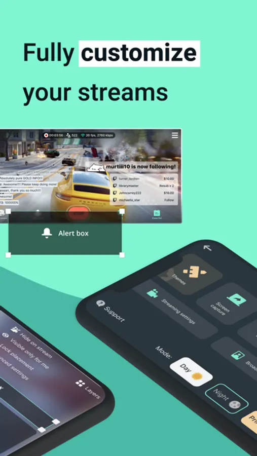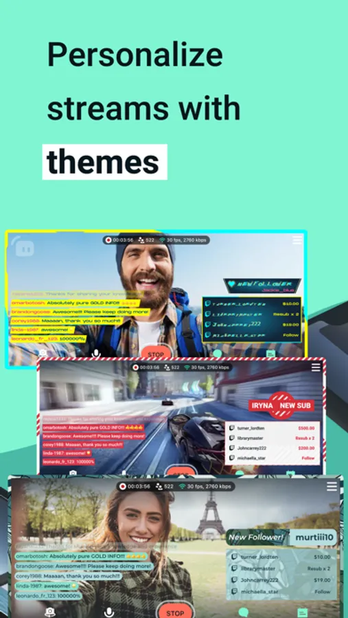 Whether you're game streaming or streaming life, customize your stream with professional mobile themes. Make your stream unique by adding beautiful overlays in a few easy clicks. You can also add your own logo, other images, and text to your stream.