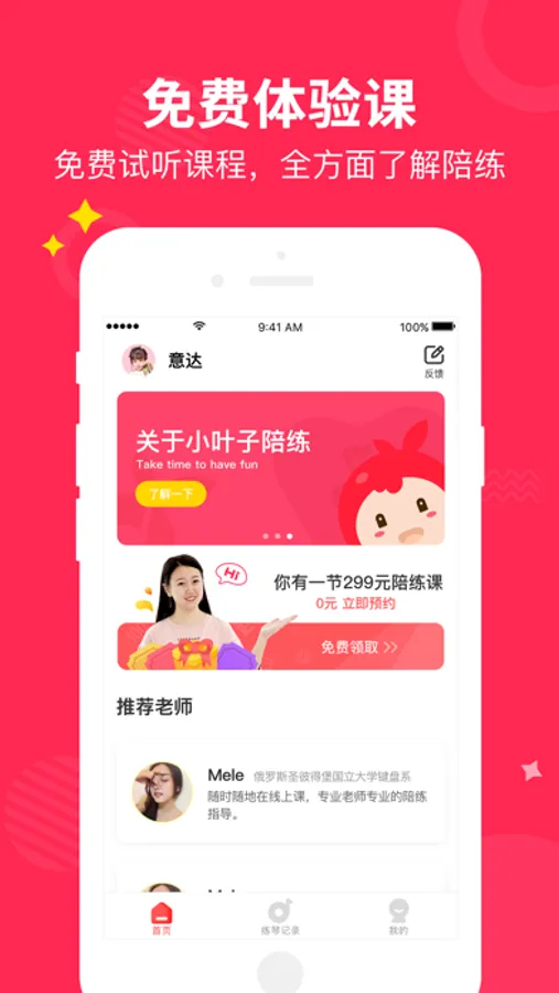 小叶子让练琴进步更快:提供老师1V1陪练、真人视频指导、自主约课、专属课管答疑解惑、课后陪练点评等几大功能。