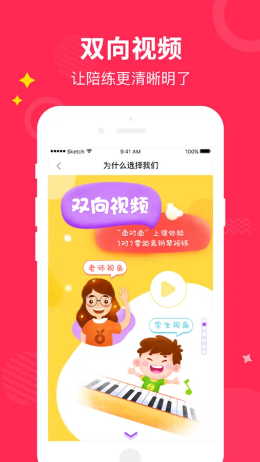 小叶子钢琴1v1陪练是一款老师和学生互相能看见的在线钢琴陪练APP,由来自各大音乐院校专业的老师,通过1对1双向视频的陪练模式,提供随时可示范弹奏的陪练服务。“面对面”的陪练体验,高效解决手型指法、错音节奏等各类练琴问题,巩固课上学琴成果、提升课后练琴质量。