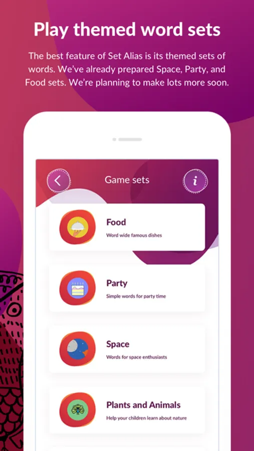 The best feature of free Alias is it's themed sets of words. We’ve already prepared Space, Party and Food sets. We’re planning to make lots more soon. You can also play the standard Alias to set your difficulty level and play with a random set of words.