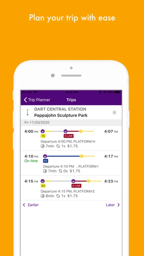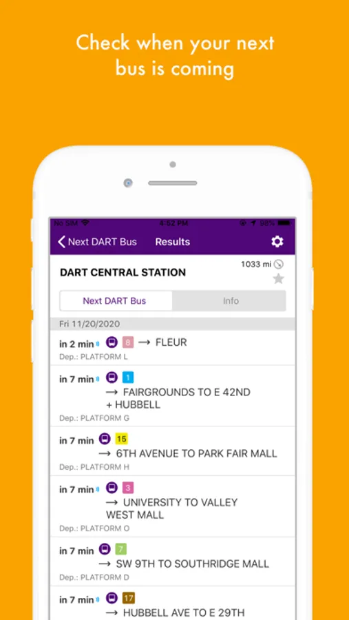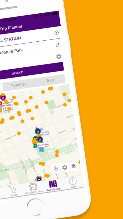 Use the MyDART app to plan a trip and access real-time arrival of buses. Enter your starting point and ending destinations for trip options that best fit your schedule. Use the Next DART Bus feature to get the real-time arrival of buses and view a map of DART bus stops near your location.