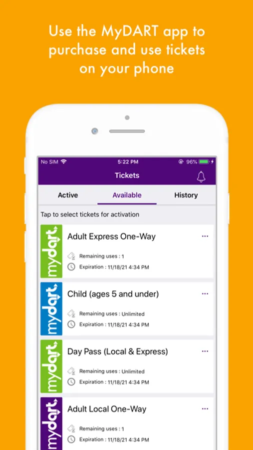 Buy your bus pass in the MyDART app and start using it on your schedule. DART offers one-way, day, 7-day and 31-day passes for use on all services. When ready to board the bus, activate the mobile ticket you want to use and show your phone to the bus operator to pay fare. If you are a Paratransit or Half Fare customer, contact Customer Service at 515-283-8100 to add those tickets to your MyDART account.
