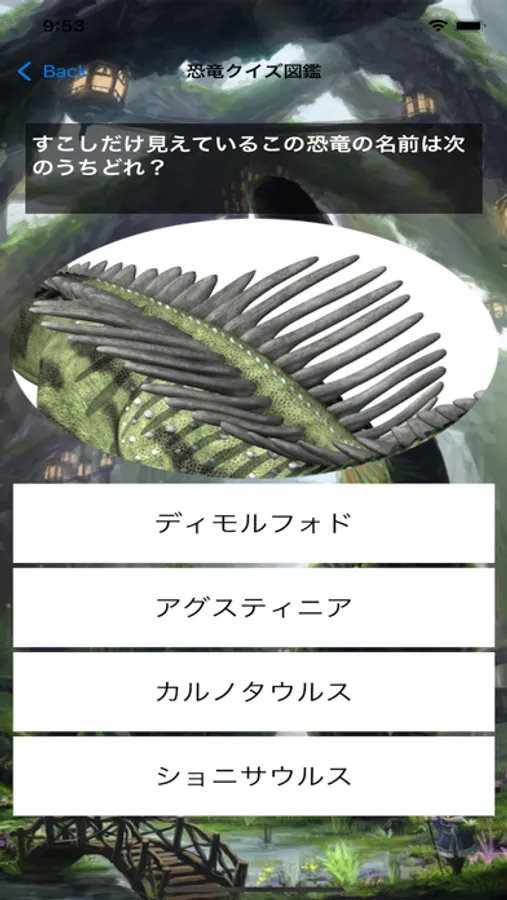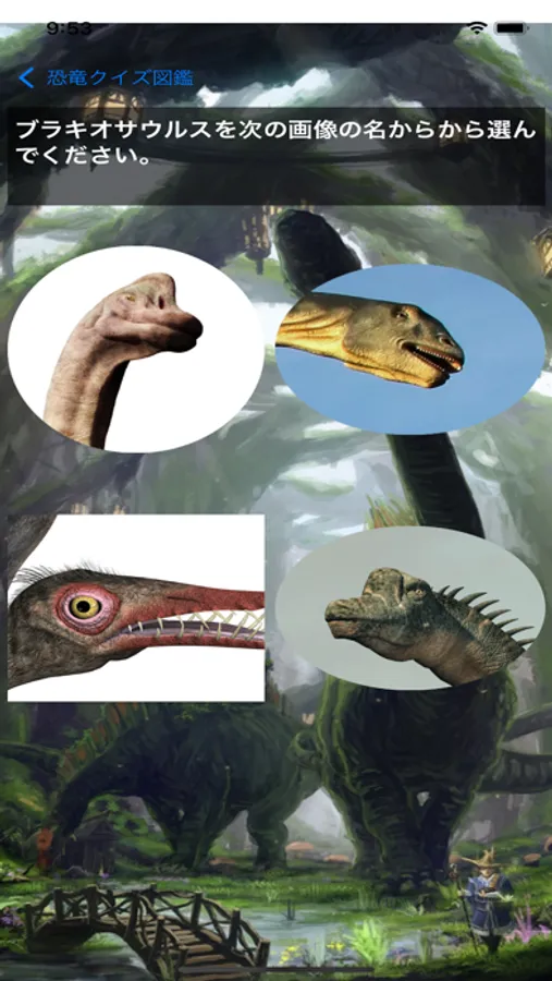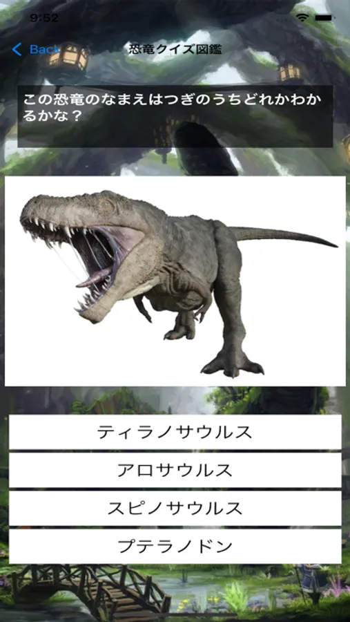 恐竜のクイズアプリ。みんな知っている恐竜から、みんなが知らない恐竜までさまざま。これを全部覚えたら恐竜博士だ!!