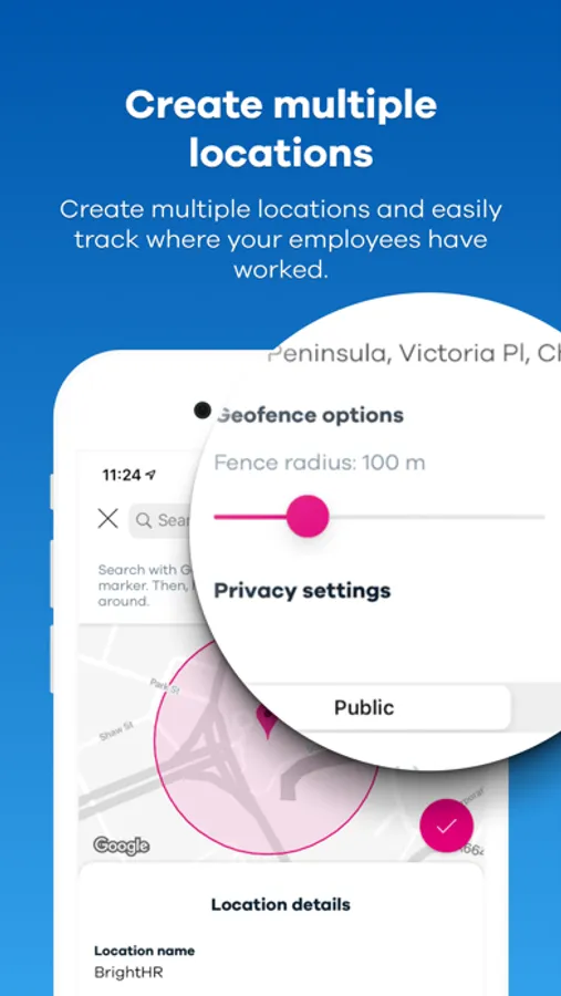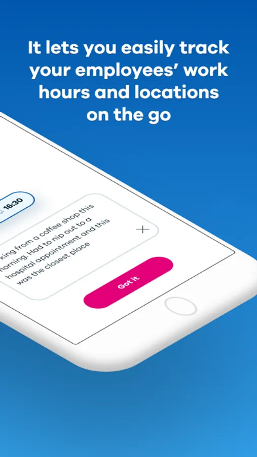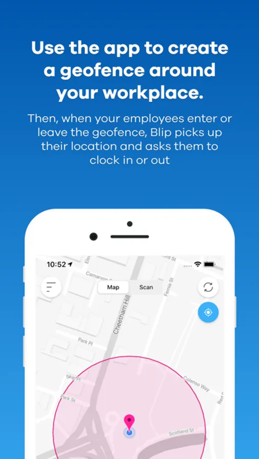 Use the app to create a geofence—a virtual boundary—around your workplace. Then, when your employees enter or leave the geofence, Blip picks up their location and asks them to clock in or out, helping you to know exactly where your staff have worked and how long for.