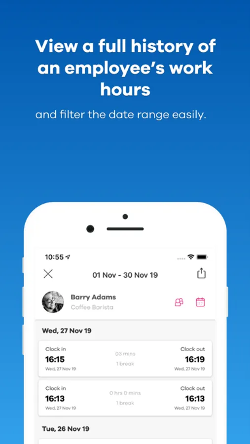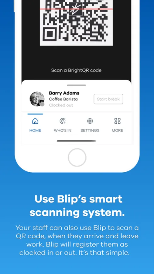 Your staff use Blip to scan a QR code—a type of barcode—when they arrive and leave work. Then, each time they scan the code, Blip will register them as clocked in or out. It’s that simple.