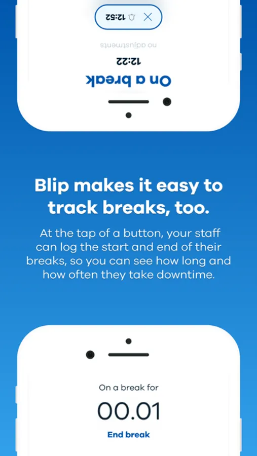 Blip makes it easy to track breaks, too. At the tap of a button, your staff can log the start and end of their breaks, so you can see how long and how often they take downtime.