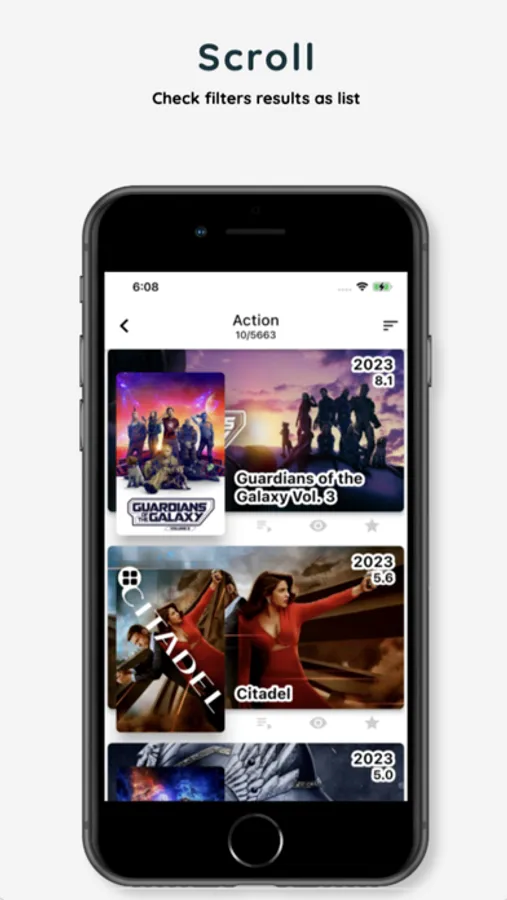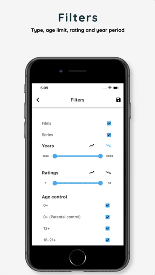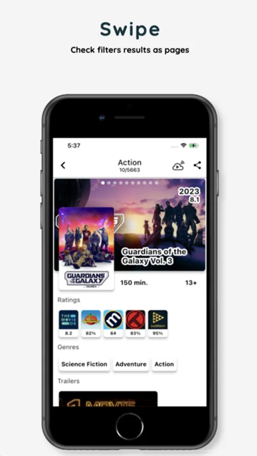 The fundament of app is simple and convenient search for movies and series by genres or collections. The main difference between the application is Trailer mode, it's the ability to search movies when viewing trailers of a specific genre or collection, reminiscent of watching trailers to new movies before the session in the cinema. At the same time there is a possibility to view the complete information of all films. Selected movies can be added to your profile's collections: watchlist, seen and bookmarked list from list and pages. You also can check filmography of more then 170 000 persons, actors and directors.