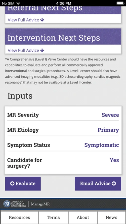 Content in this app is derived from the 2017 ACC Expert Consensus Decision Pathway on the Management of Mitral Regurgitation. The information and advice in this app are meant to support clinical decision making. They are not meant to represent the only or best course of care, or replace clinical judgment. Therapeutic options should be determined after discussion between the patient and their care provider. ManageMR is part of the ManageMR Toolkit supported by Founding Sponsor Abbott Vascular.