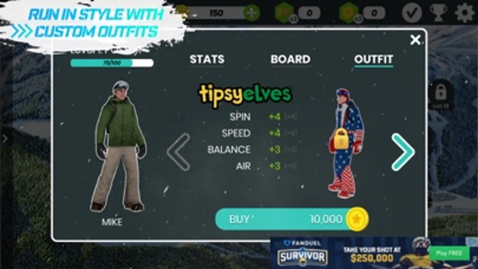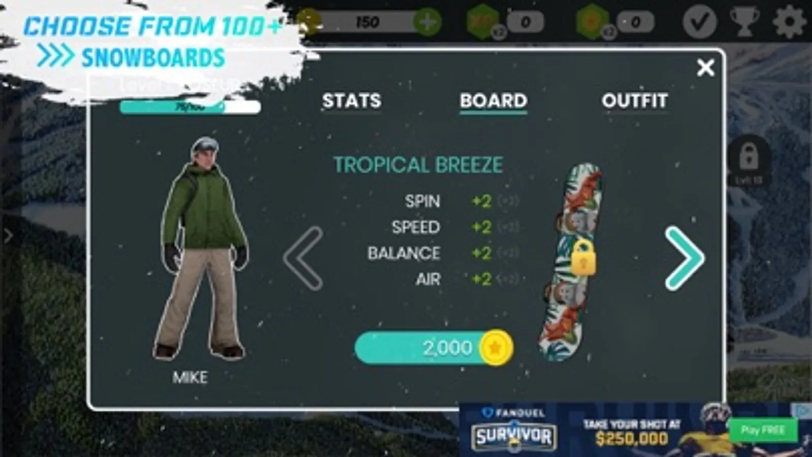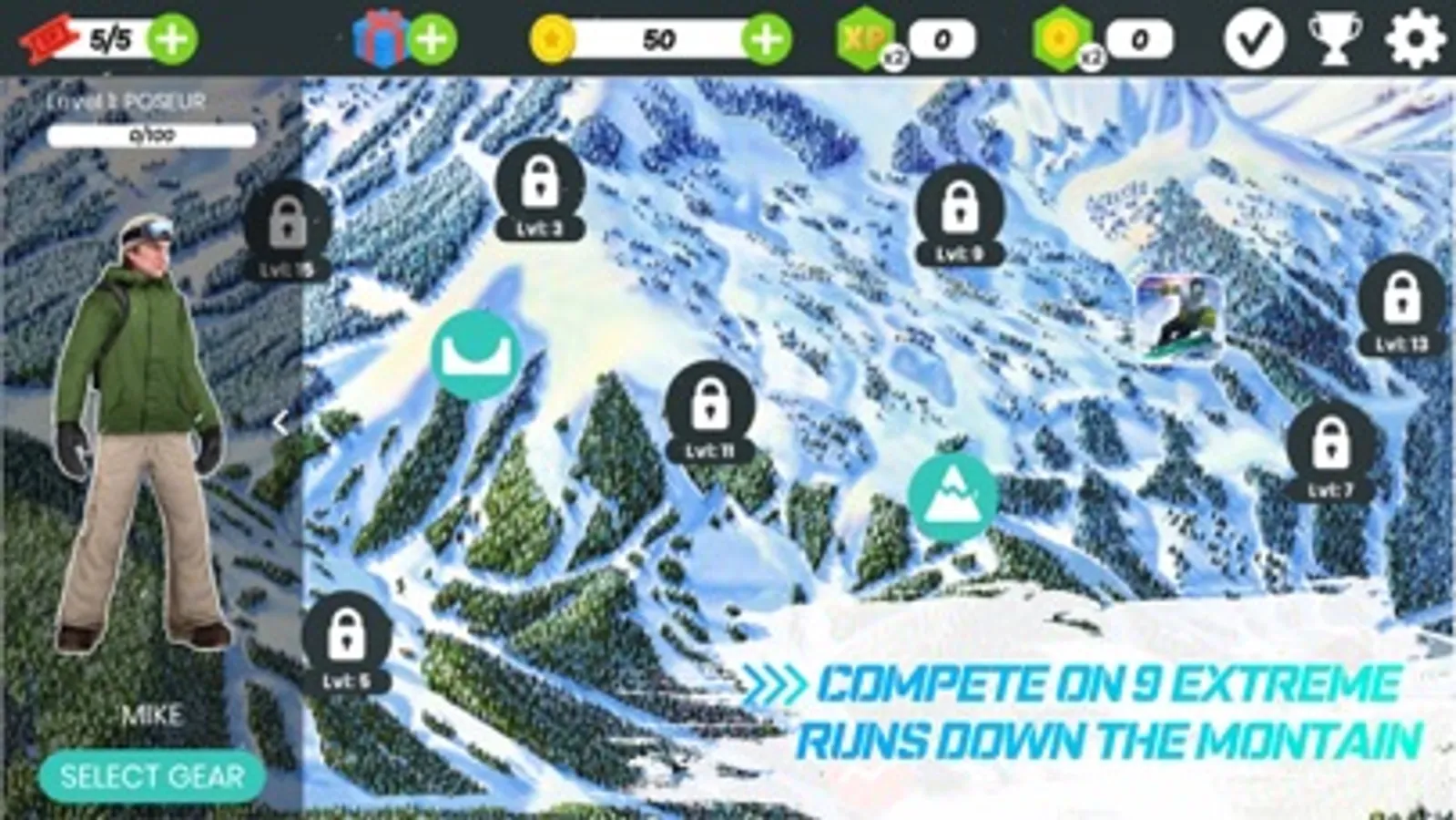 - Play often to gain experience points and upgrade your snowboarder’s stats.