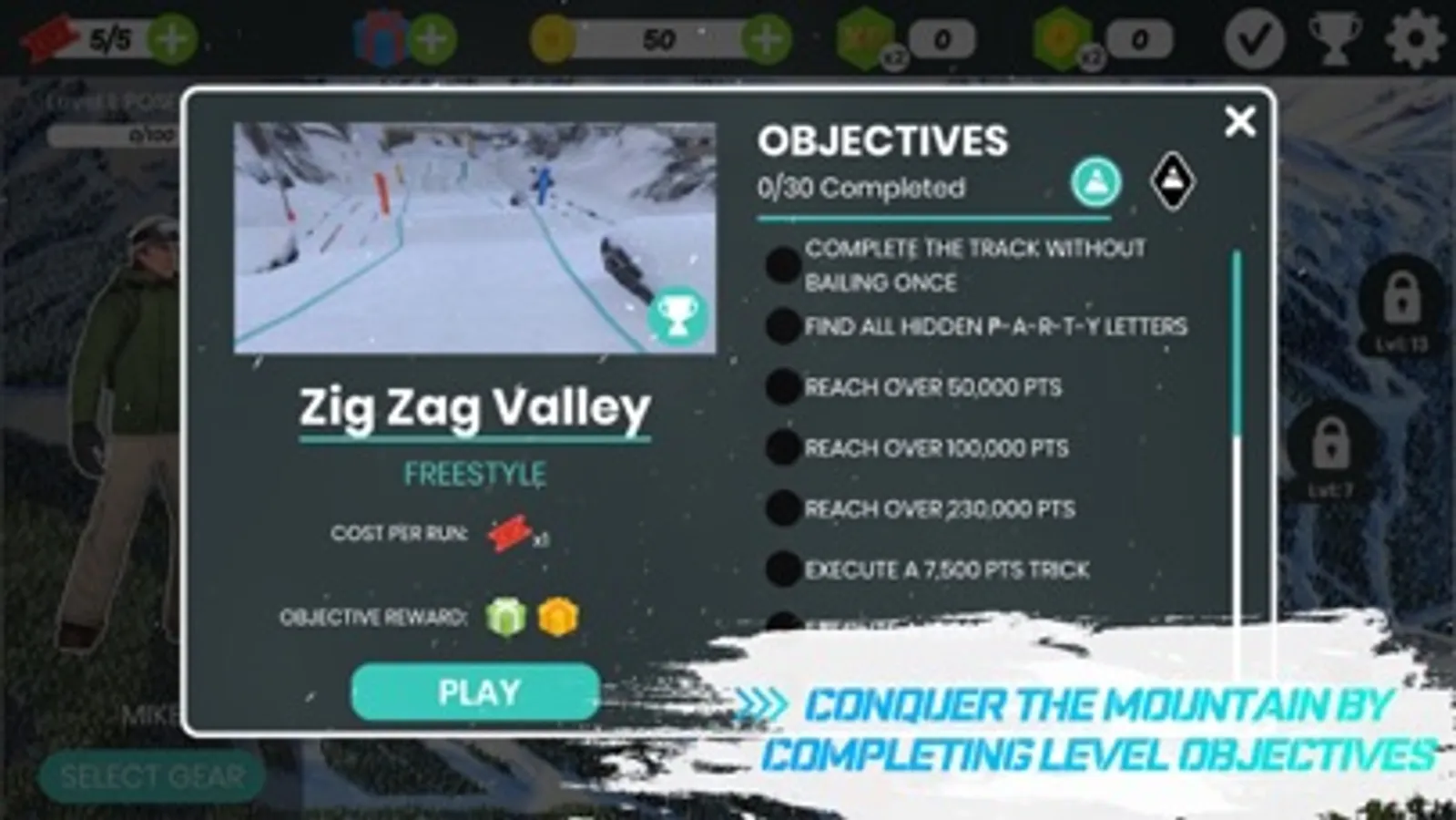 Every 4 hours, you will have the opportunity to complete a new snowboarding challenge! Complete the bonus challenge to earn rewards, lift tickets, coins, and exclusive gear.