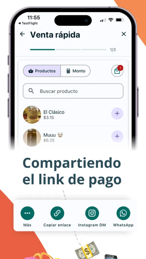 Envía un enlace de cobro o todo tu catálogo web a tu cliente por WhatsApp, Instagram, email o cualquier otro medio.