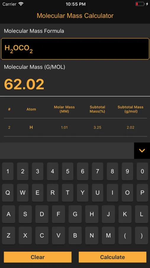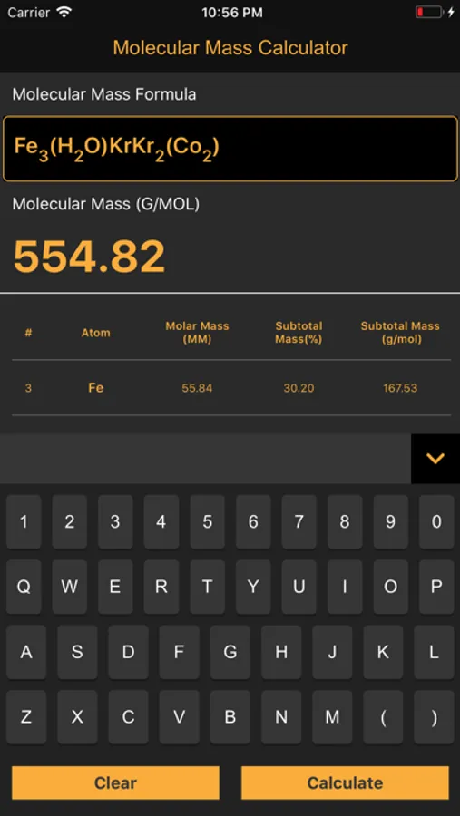 A calculator to determine the molecular mass, mass percent, and element info for any molecule. An excellent tool for any chemistry student or professional, at any level. No longer will you have to constantly check the periodic table for molecular masses. Simply type in the chemical formula into the app and you are done!