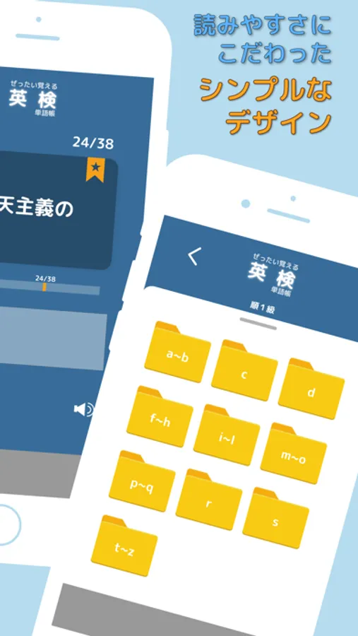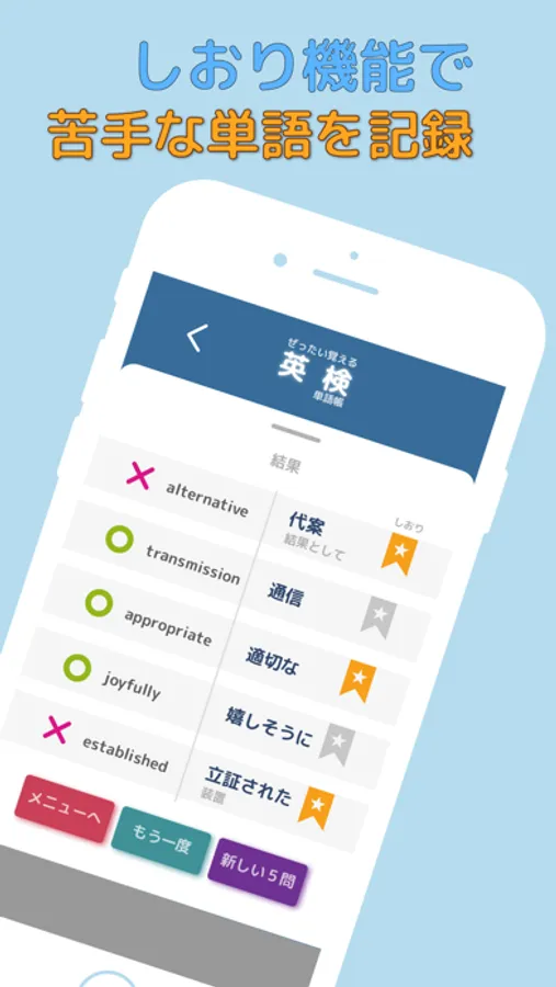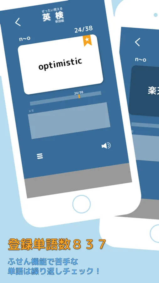 837個の英単語をフォルダでまとめてあるので、少しずつ、確実に単語を覚えることができます。覚えられない単語には付箋をつけて、苦手な単語のみを集中して復習することもできるので、とっても便利。シャッフル機能も使えば、より確実に単語を覚えることができます。