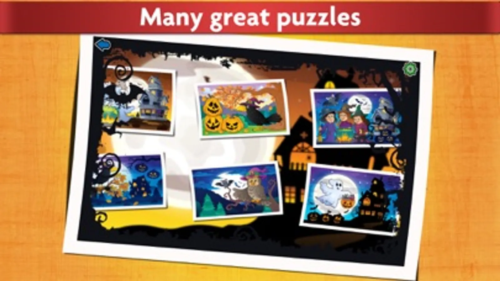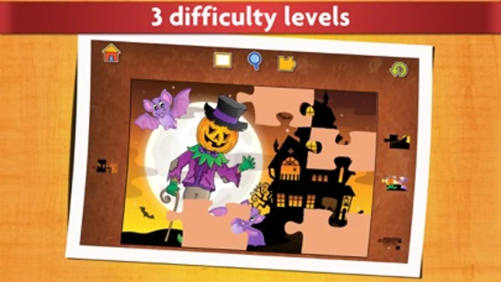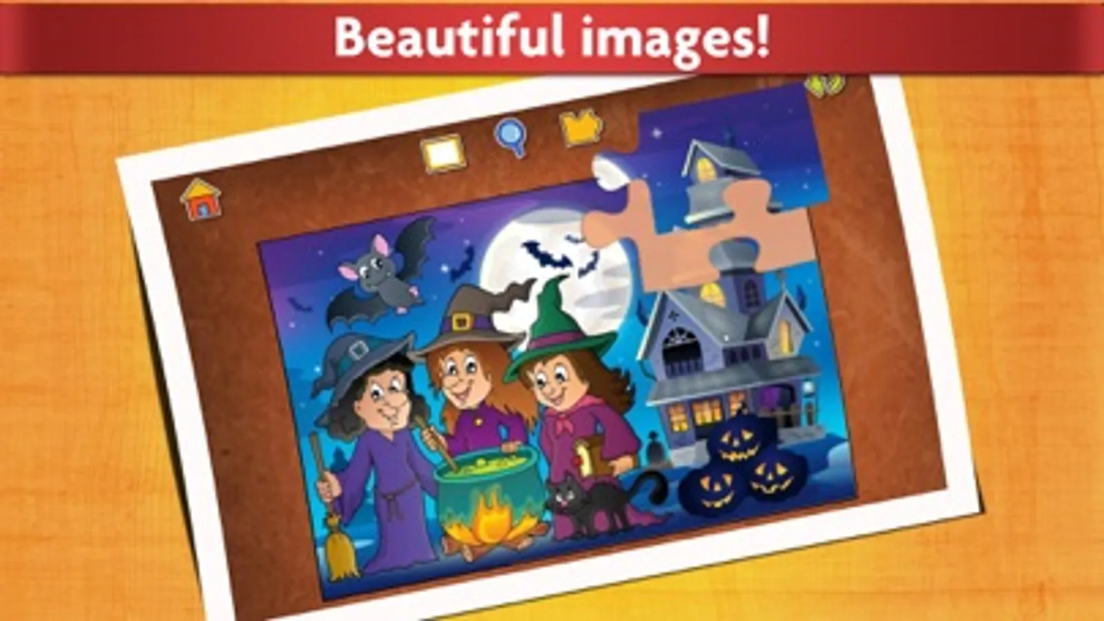 Halloween Puzzle works almost like real jigsaw puzzle game for kids and toddlers. Once you pick a piece it stays on the board even if you place it incorrectly, and you can nudge pieces around until it snaps to the right slot.