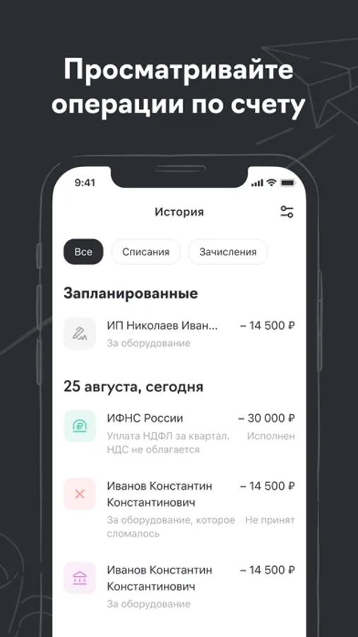 - Получать уведомления о поступлении денег на расчетный счет и статусе финансовых операций