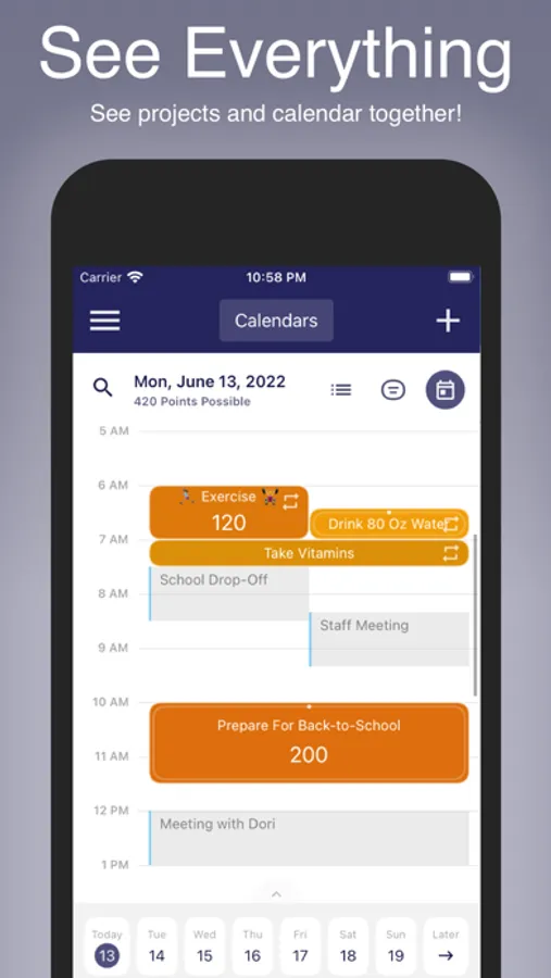 The Calendar view lets you see your projects overlaid with your appointments and meetings to show you know when you have time to work on projects. This is great for time-blocking!