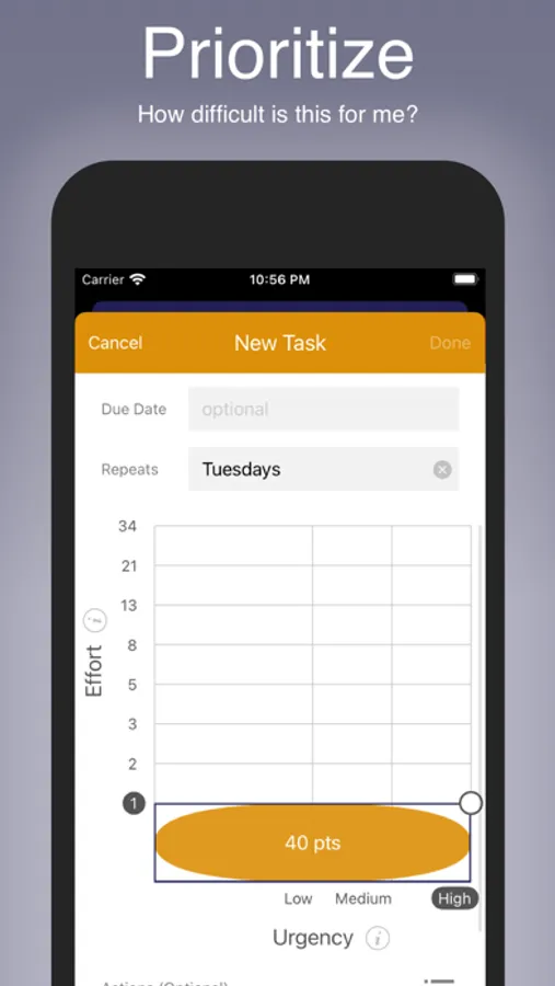 Enter your project and choose the urgency, effort, and the impact it will take to complete (big things are big, small things are small!). Also, projects can easily repeat: Enter your task once, choose how often it occurs, and count on it to appear as scheduled.