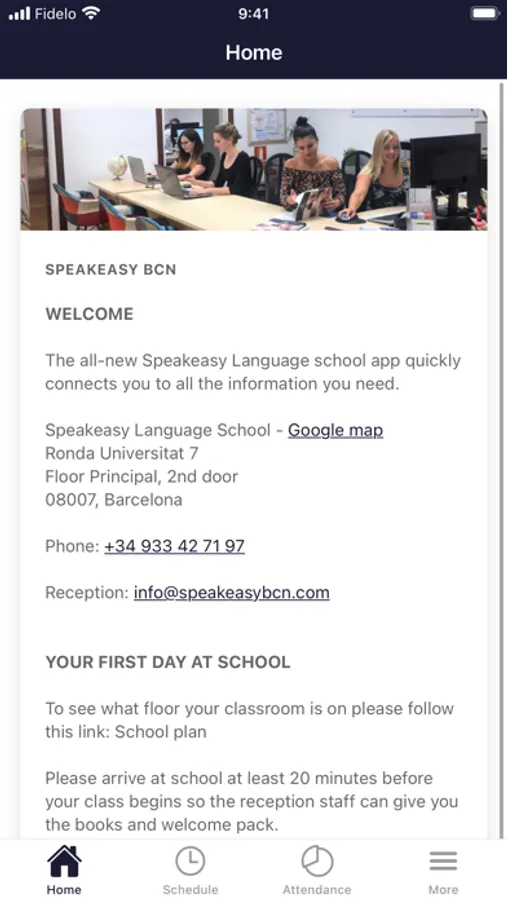 The Speakeasy Spanish School app provides students with information about courses, classroom location, attendance, important documents and more.