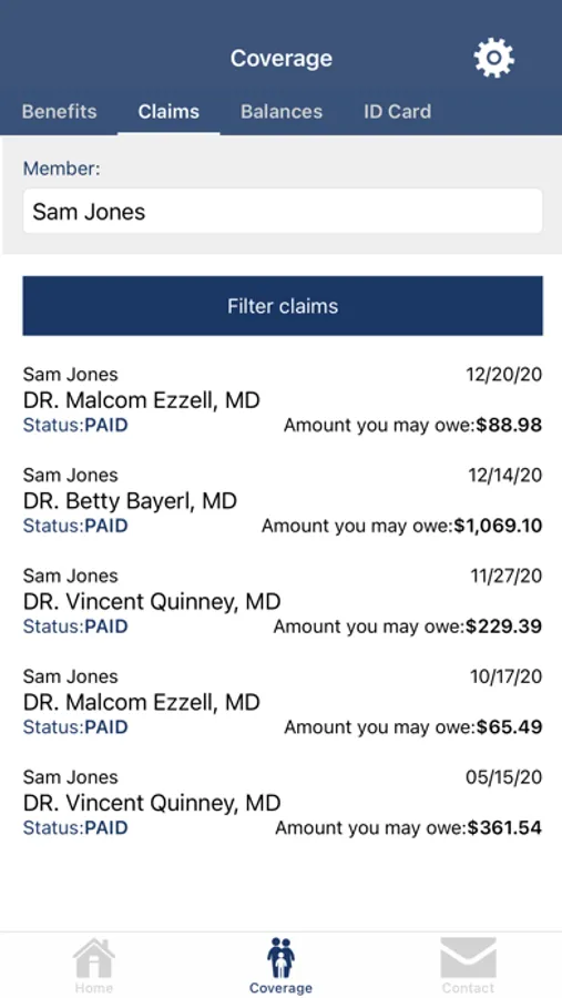 See your ten most recent claims. Get a detailed view of each one. Or look up specific medical, dental, vision, hearing claims by member name.