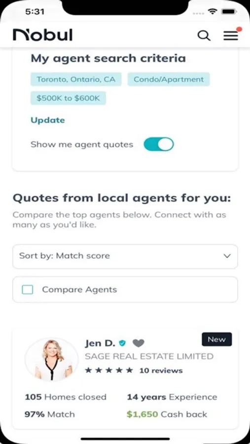Nobul truly is the world’s only open digital marketplace connecting home buyers and sellers to the right real estate agent for them. Nobul’s revolutionary platform introduces transparency, choice, accountability, and simplicity to the real estate industry by enabling consumers to choose the agent who presents the combination of services, pricing, reputation, and fit that is best-suited to them personally.