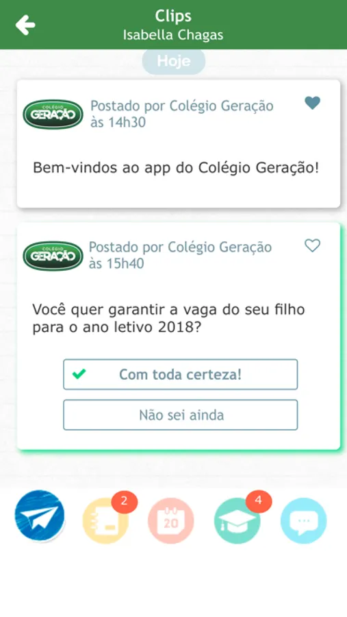 A comunicação com o Colégio Geração ficou ainda melhor. A agenda escolar foi otimizada em forma de aplicativo, onde os pais ou responsáveis poderão ter acesso, através de seus celulares, a informações diárias de seu interesse, enviadas por professores, coordenadores e equipe geral. O aplicativo Colégio Geração permite também que os pais ou responsáveis se comuniquem com o Colégio. Faça parte desta novidade e fique cada vez mais próximo do dia a dia do seu filho!