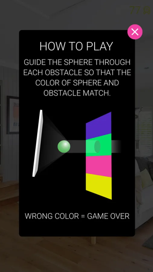 Guide the sphere through each obstacle so that the color of the sphere and obstacle match. You will need to move the whole device to play and not just tilt it to look around!
