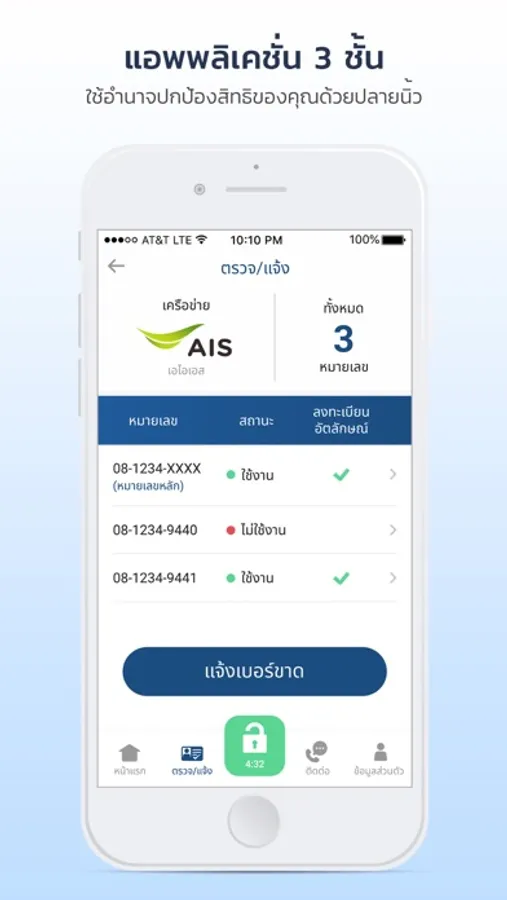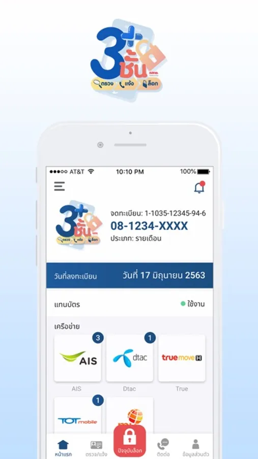 สำนักงาน กสทช. เล็งเห็นความสำคัญในการสร้างเครื่องมือให้ประชาชนสามารถตรวจสอบข้อมูลเบอร์โทรศัพท์มือถือของคุณและปกป้องตนเองจากการใช้งานโทรศัพท์มือถือ จึงได้จัดทำแอพพลิเคชัน 3 ชั้น “ตรวจ แจ้ง ล็อค” โดยสามารถ “ตรวจ” ว่ามีการลงทะเบียนการใช้เบอร์โทรศัพท์มือถือไว้จำนวนกี่เบอร์ “แจ้ง” เบอร์แปลกปลอมและเบอร์ที่ขาดหายไป “ล็อค” เพื่อป้องกันผู้อื่นนำบัตรประชาชนของคุณไปแอบอ้างเปิดซิมใหม่ และสามารถทำการ “ปลดล็อค” จากแอพพลิเคชัน 3 ชั้น ได้ด้วยตัวคุณเอง
