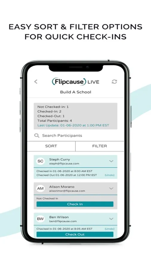 Access all of your Event Participants and Volunteers through the Flipcause app for one-click check-ins and check-outs. All check-in and check-out activity is timestamped and syncs in real time with your Flipcause event & volunteer campaigns and reports.