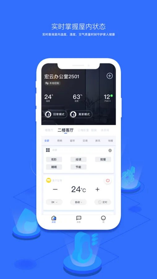 - 实时了解室内温度、湿度、空气质量,时刻守护家人健康