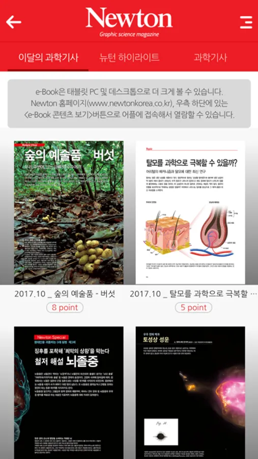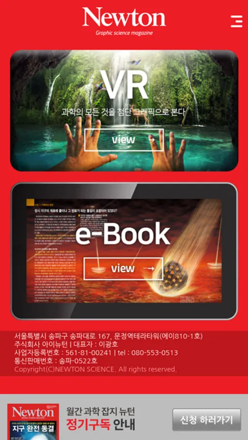 자연과학 8개 분야의 과학 기사를 VR과 e-Book으로 구독할 수 있는 어플리케이션입니다(매달 업데이트).