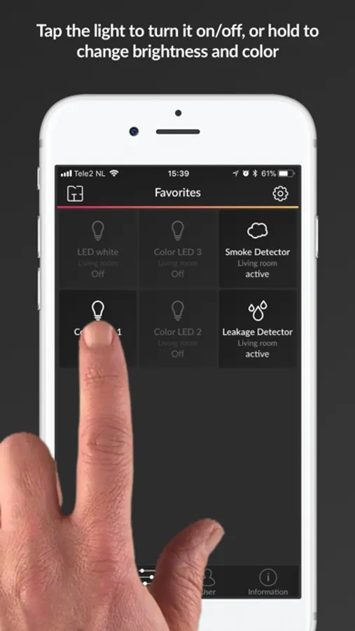 The cards in your home tab give a clear overview of your home, and the device tiles in the control tab allow for easy and fast control of all your accessories.