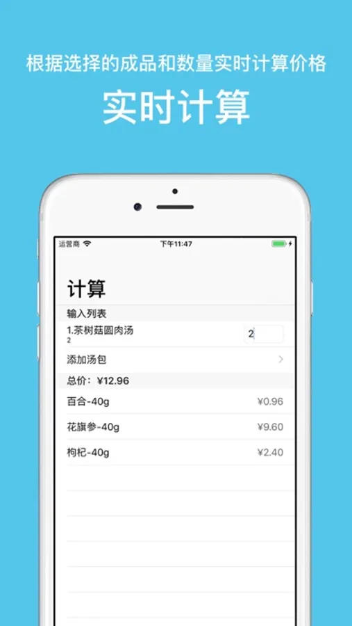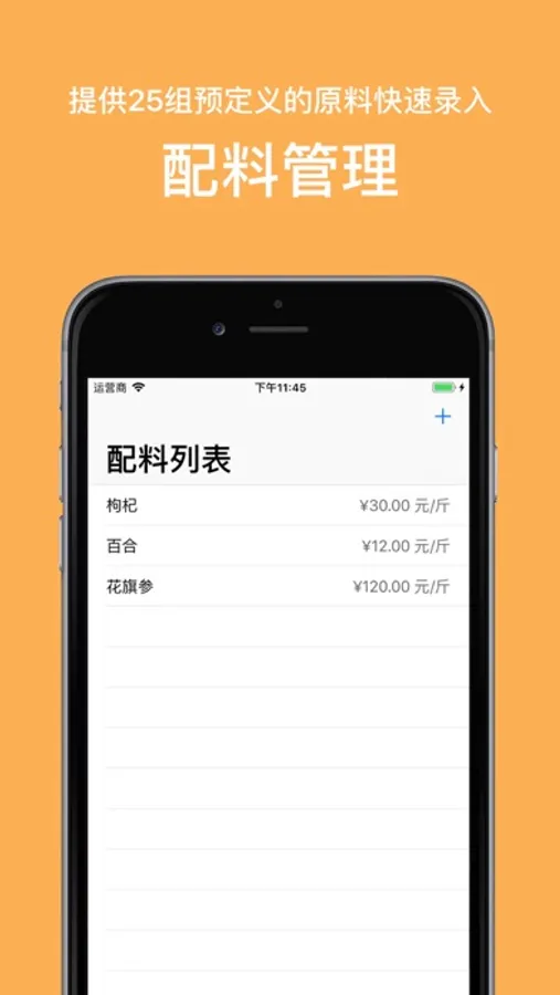 支持自定义添加和管理药材、汤包的配料;支持配料快速输入,提供25组预定义的原料快速录入