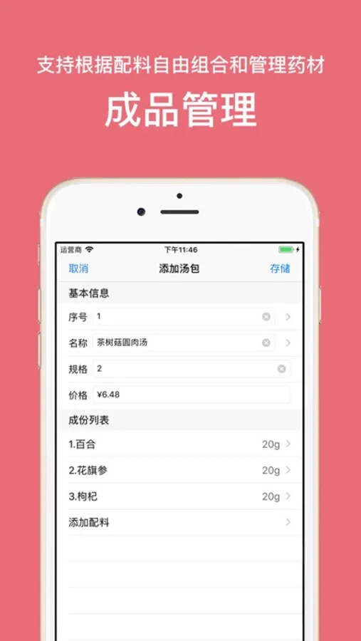 支持根据配料自由组合和管理药材、汤包成品;成品包括基本信息和成份列表