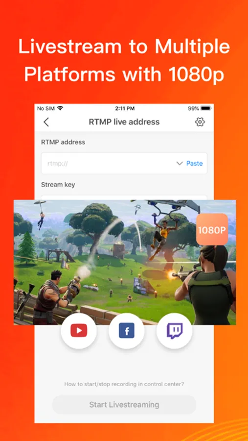 Add the screen recording feature to your control center. Simply log in to your YouTube, Facebook and Twitch account, choose the settings as you want, and start livestreaming to YouTube, Facebook and Twitch via the screen recording feature! These handy options give you a better livestreaming experience: