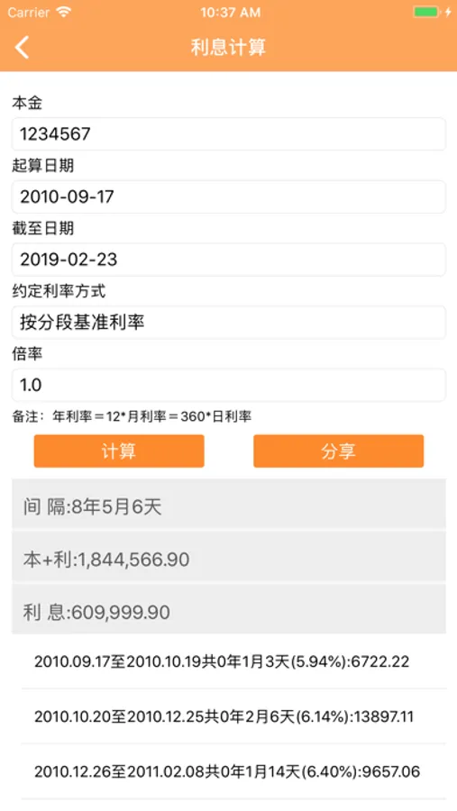 4、利息、违约金计算。支持按给付日基准利率、按现行基准利率、分段利率,手动输入日利率、月利率、年利率等算法。