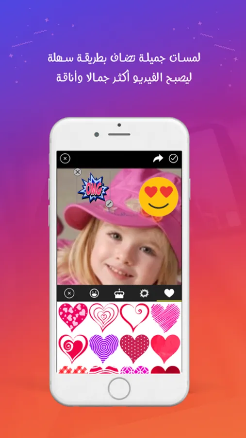 إضافة الملصقات و الصور على الفيديو: هذه الخاصية ستمكنك من إضافة الصور و الملصقات على الفيديو في أي موقع تريد، و ستكمنك المجموعة الرائعة من الملصقات من إخراج فيديو مؤثر و جميل.
