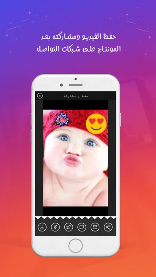 الحفظ و المشاركه: في أي وقت تريد ستتمكن من حفظ الفيديو على جهازك، كما و أن التطبيق يدعم مشاركة الفيديو عبر جميع وسائل الإتصال المشهورة من فيسبوك و إنستقراما و تويتر وواتس اب و فاين و كييك و غيرها …