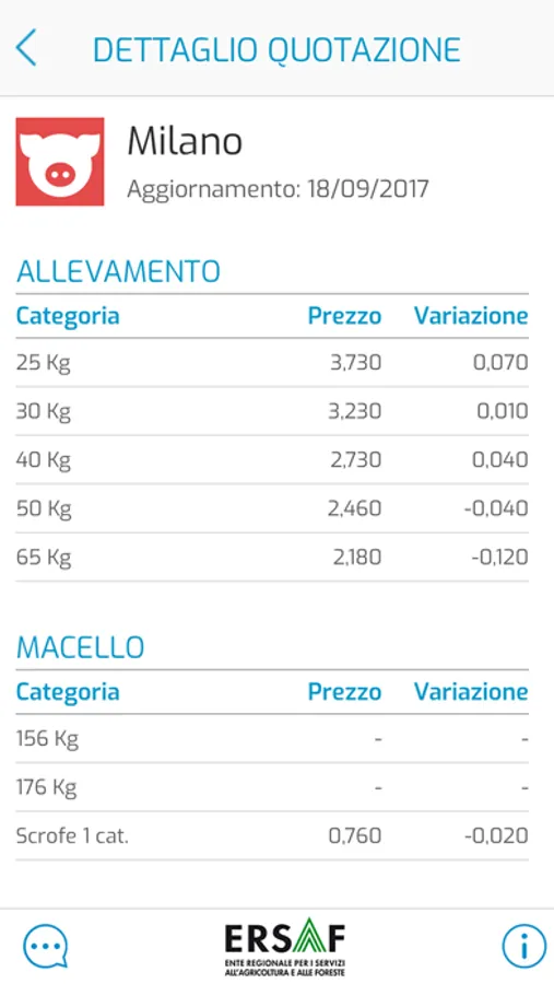 L'APP PrezziSuini di ERSAF, è costruita su misura per tutti gli operatori che vogliono essere informati quotidianamente in tempo reale sulle quotazioni delle principali categorie di allevamento da Macello DOP dei maggiori mercati suinicoli nazionali.