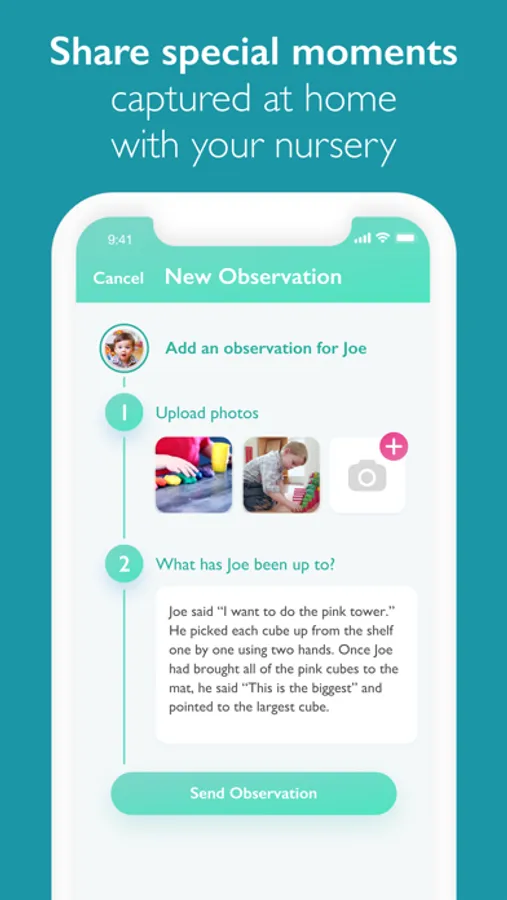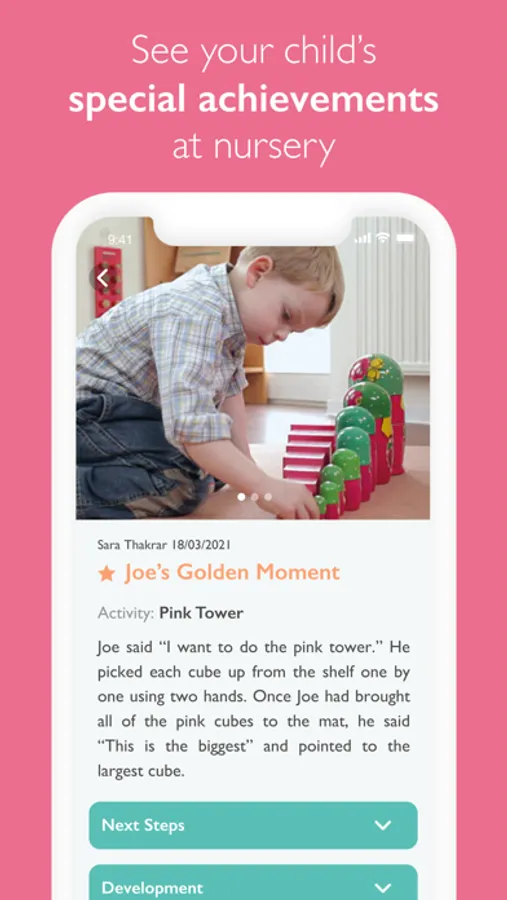 Blossom connects parents with their children and the nurseries which look after them. Engage in your child’s day with a real-time diary feed, displaying everything from sleep to activities, snacks to nappy changes. Share your child’s developmental moments from home directly with the nursery, creating stronger communication and supporting your child in their early years.