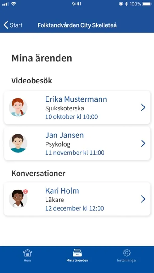 Här kan du antingen boka en tid själv eller ansluta till ett videobesök som din vårdgivare har bokat in åt dig. Mottagningarna i appen har olika utbud.