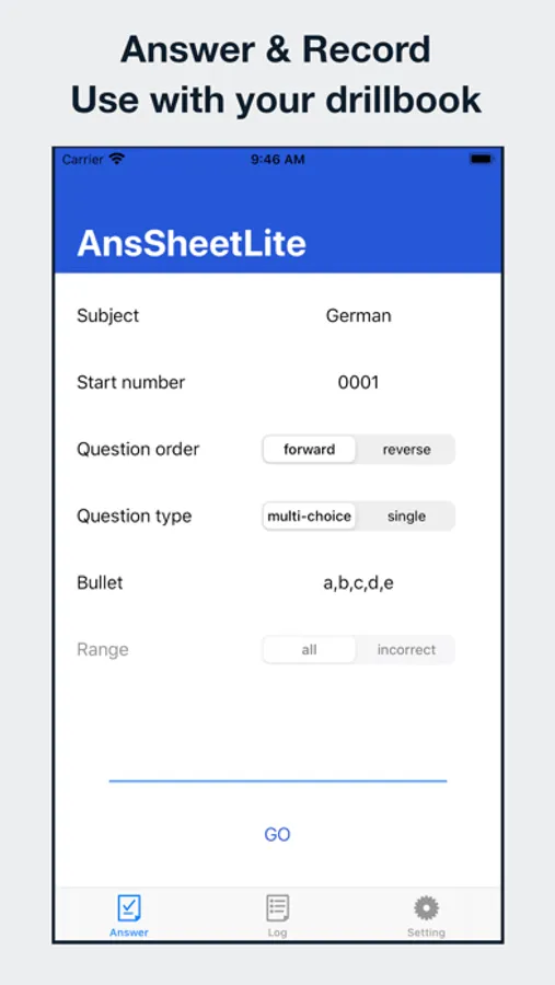 AnsSheetLite is an electronic answer sheet that records answers using workbook you have(Question is not attached with this App). A recording of your exercise cycle (count, interval) helps to keep your study schedule and keeps your motivation. Also, you can analyze your weak points by confirming the question that makes many mistakes.