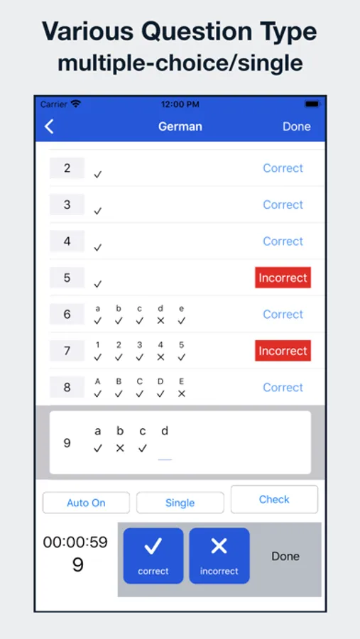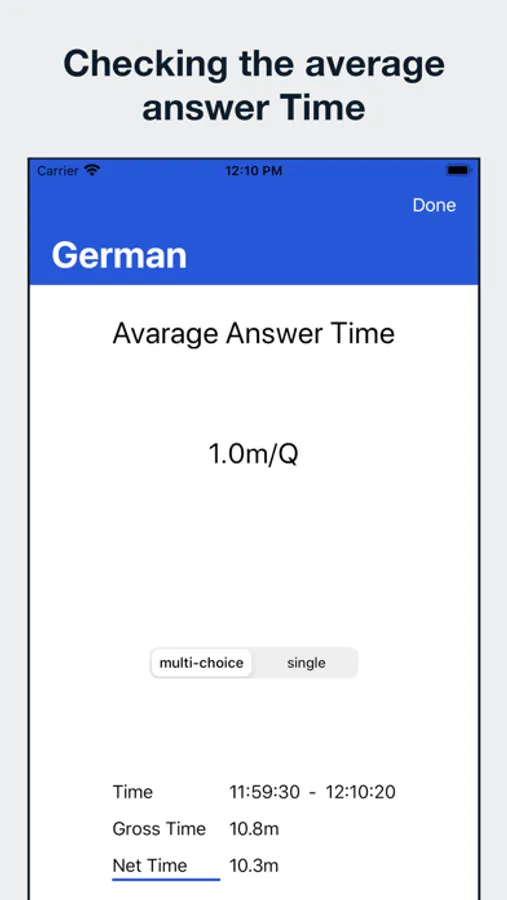 + Elapsed time and average answer time per one question(You can make a time plan for the exam)
