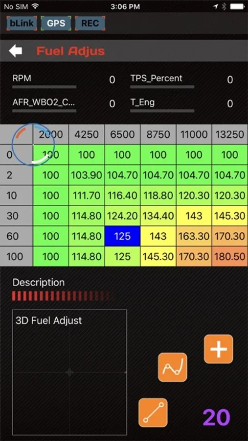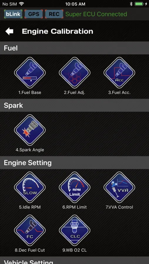 5. Engine parameters adjust: Fuel Base, Fuel Adj., Fuel Acc.,Spark Angle, Idle RPM, RPM Limit, VVA Control, Dec Fuel Cut, Auto Tune, WB O2 CL, Quick Shift, Speed Gain, Coolant Fan, TPS Learn
