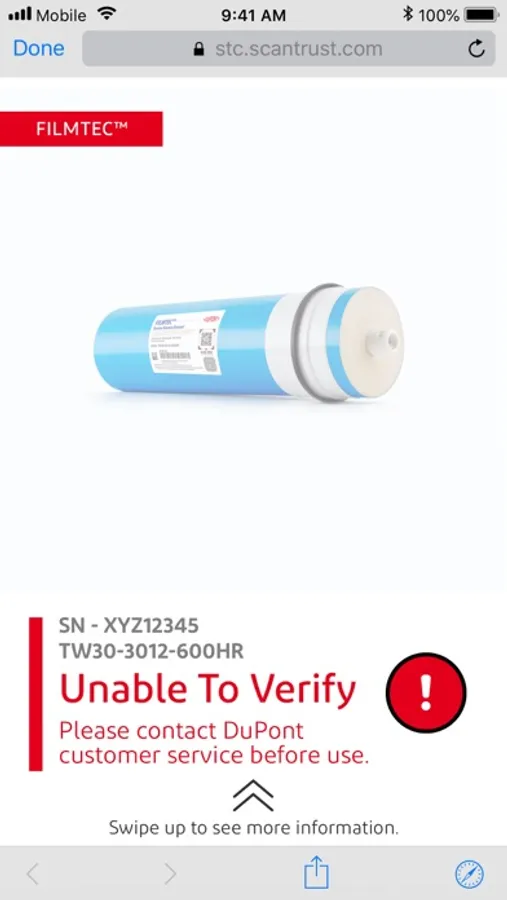 Scan now with the DuPont Home Water mobile app to verify that your DuPont Home Water products are genuine or counterfeit, learn about product details, access special promotions, and contact DuPont directly. Unlike standard QR codes, DuPont Home Water products contain an extra layer of security called the ‘secure graphic’ inside the QR code. This secure QR code and scanning technology is powered for DuPont by ScanTrust, a leading secure solutions provider.