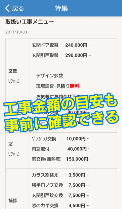 これまで実際におこなった工事の施工事例や、目安となる金額が確認できますので、『こんな工事はできるのかな?』『いくら位かかるんだろう?』といったお悩み解決のきっかけにもしていただけます。