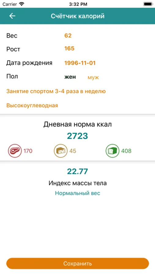 Чтобы правильно организовать свое питание, важно знать состав и калорийность употребляемых продуктов, а также содержание жиров, белков и углеводов. Похудеть или набрать вес Вам поможет тонкая настройка диеты. Счётчик калорий позволит рассчитать количественные и качественные характеристики Вашего меню. Выберите из готового списка продукты, нужные Вам, и введите их вес в граммах.
